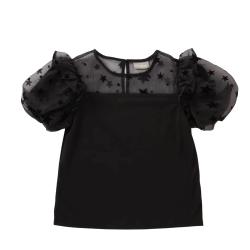 Let her shine bright with this Girls Black Star Mesh Puff Sleeve Top, a dazzling addition to her wardrobe thatβs perfect for parties, special occasions, or adding a touch of sparkle to her everyday style. Black top with a sheer mesh overlay adorned with glittery star patterns for a magical, eye-catching look. Dress it up with a pair of sparkly shoes and a statement necklace.