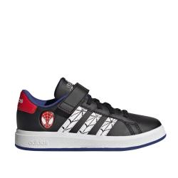 Unleash the superhero within with the Adidas Marvel Grand Court Spider-Man shoes. These unisex kids shoes, designed for both street and play, are a timeless classic with a fun twist. The synthetic upper ensures durability while the rubber out sole provides reliable traction. Featuring elastic laces and hook-and-loop closure for easy wear, these shoes also sport a Spider-Man head on the side and iconic Spider-Man colors for an exciting look - in addition to that there is a spider web printed on the 3 stripes. Let you